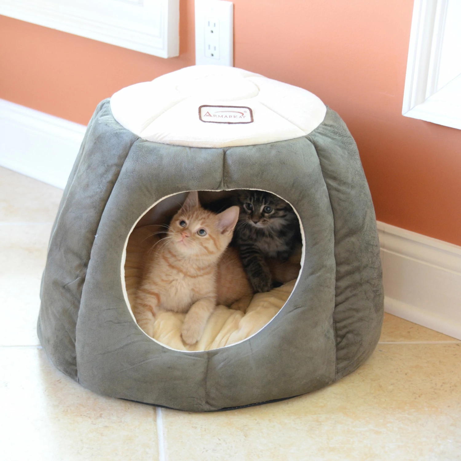 Spice up catnaps with Armarkat Model C30HML/MH cat bed. This laurel green and beige cat bed is shaped like a hut to hug your pet. It features luxe velvet and buttery faux suede.The bed is filled with extra-thick, 100% polyfill for the maximum in comfort. Cat lovers will appreciate the bed?s machine washable pad and waterproof and skid-free base. Hand wash the pet bed. Six months manufacturer?s warranty against defects.