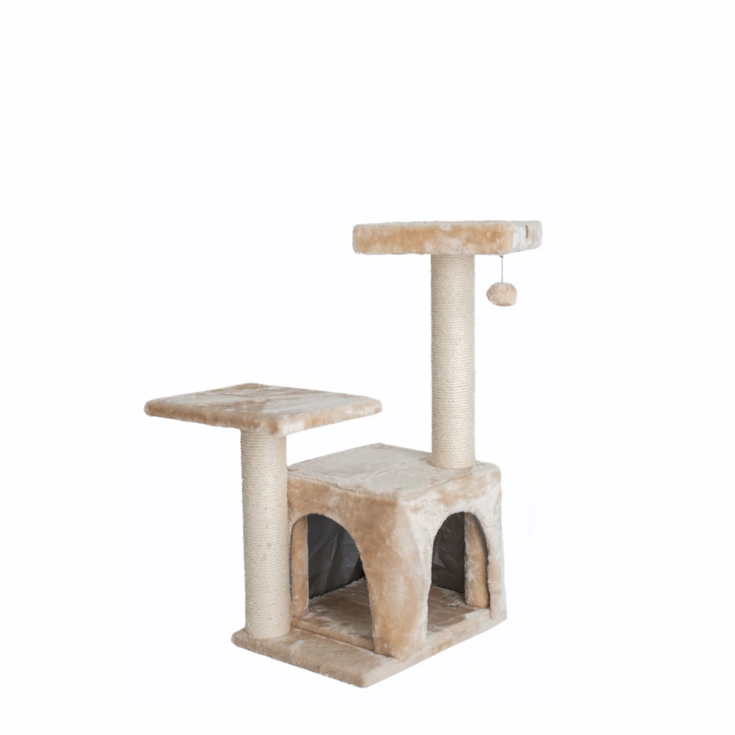 Armarkat model A3207 cat tree has three levels of activity for curious cats.There is a large playhouse on the bottom, along with a small middle perch and a larger top perch.Two scratching posts are included to keep the nails at bay.The tree is covered in a cushiony beige plush. It is easily assembled with tools and step-by-step instructions included.The soft-design condo makes it easy for transportation when necessary.
