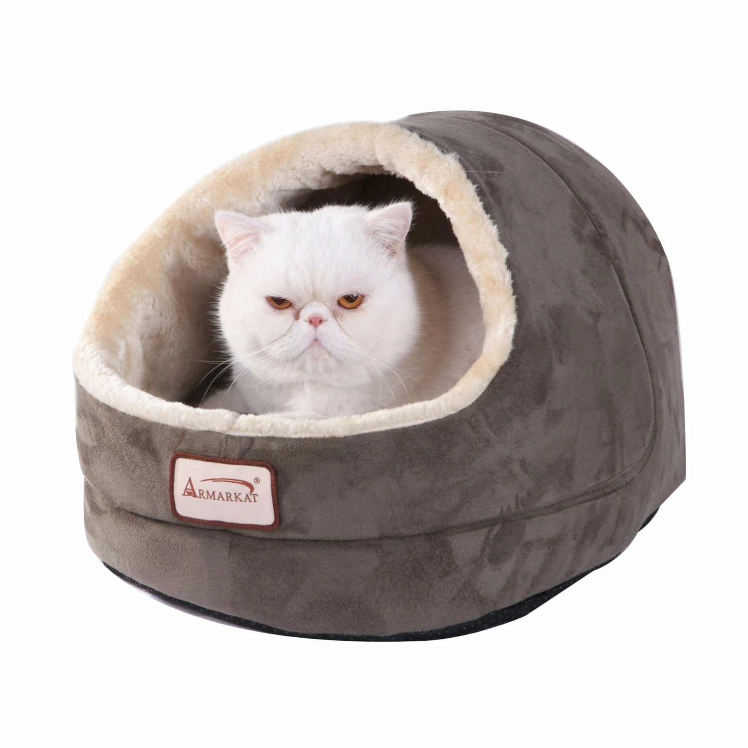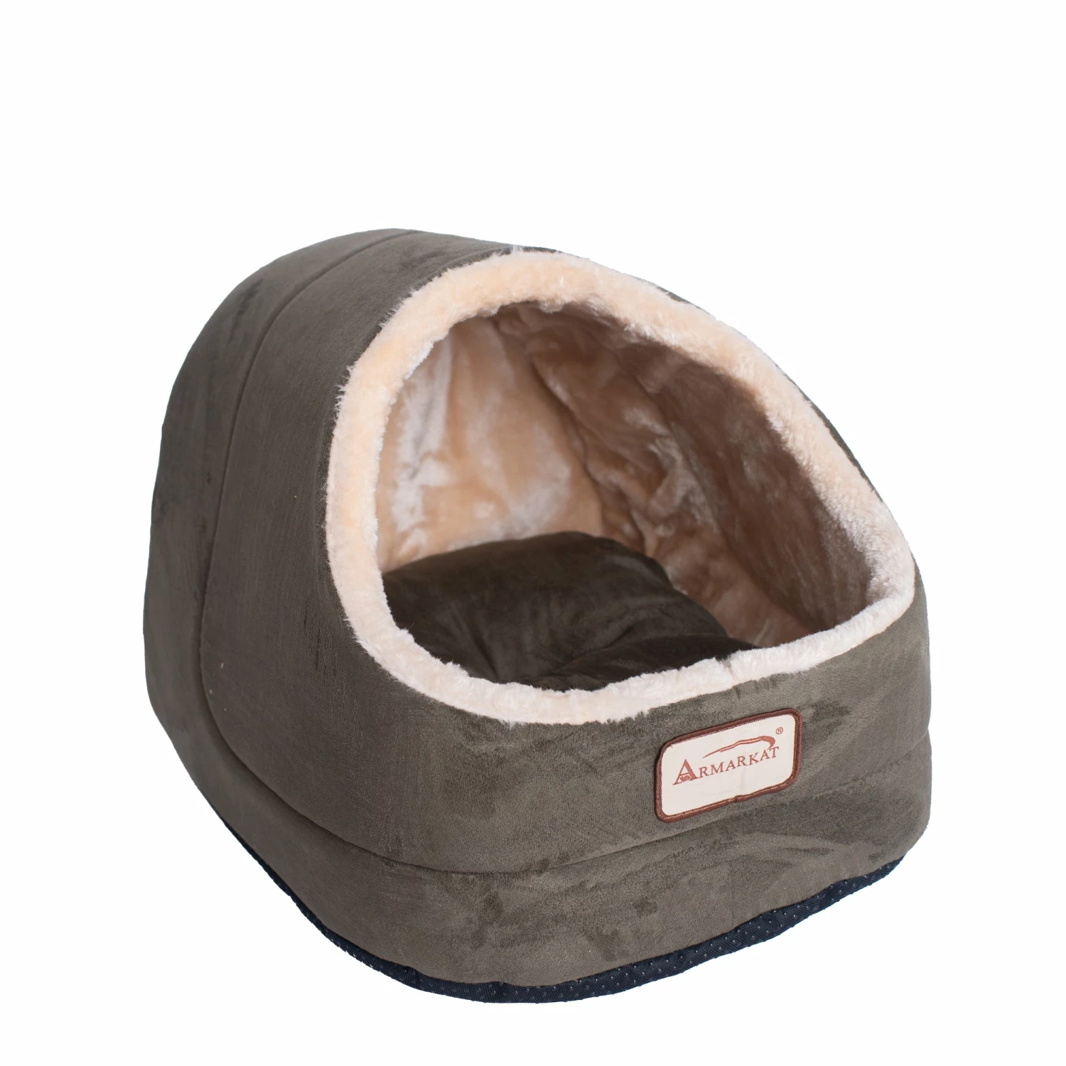Give your adult cat its own hiding spot with Armarkat Model C18HML/MH cat bed. This beige and laurel green cat bed is filled with extra-thick, 100% polyfill for your kitty?s comfort. It has a waterproof and skid-free base, as well as a insert padding. Your pussycat will love to snuggle in the bed?s buttery faux suede and faux fur. Hand wash the pet beds, and machine wash the padding. Six months manufacturer?s warranty against defects.