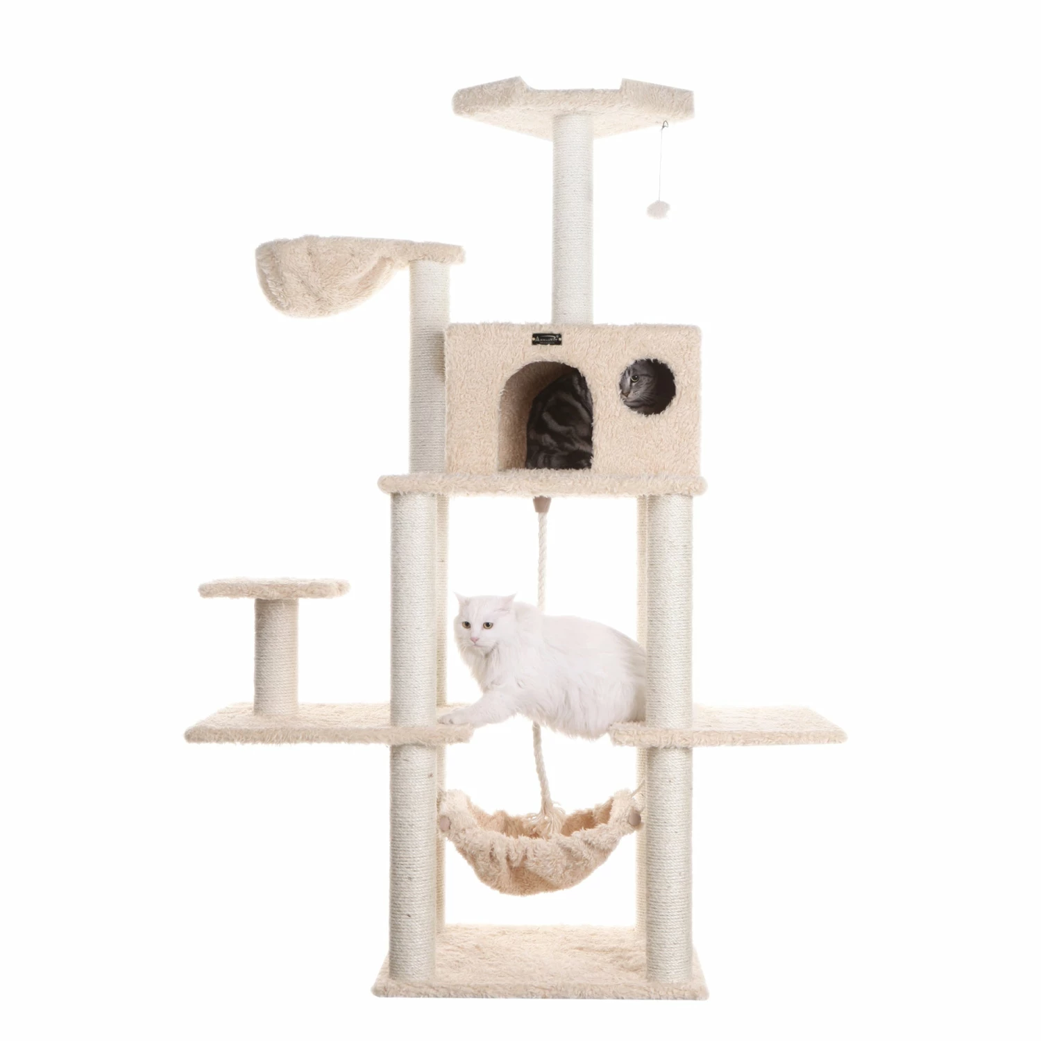 Armarkat model no. A6901 features a swinging hammock, a playhouse, a lounging saucer, a thick 100% cured sisal rope toy and multiple perches and scratching posts for your cats total enjoyment. Cat daddy approved by noted cat behaviorist Jackson galaxy, your cat(s) will be in the lap of luxury with this tree. Comes with easy to assemble step by step instructions and tools.