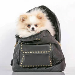 This luxurious Prince and Princess dog backpack is perfect for travel or for a walk around town. Extremely elegant and made of quilted black faux leather, it comes equipped with a safety hook, taupe lining and a cushion made of soft faux fur on the inside. The pocket on the front for personal items is enriched with golden studs and adjustable suspenders.