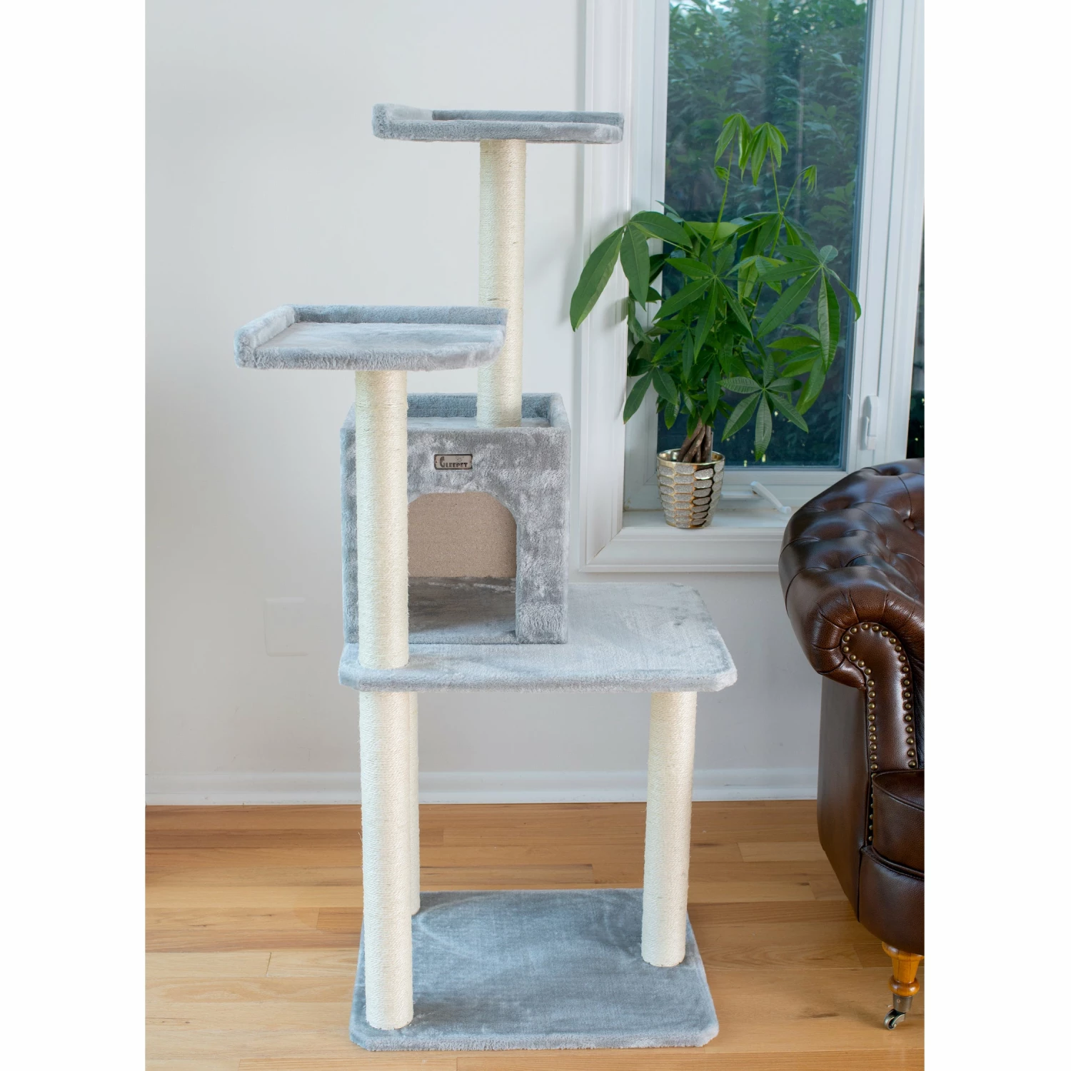 The GleePet model GP78571022 57-inch cat tree features a two-door condo for your kitties to enjoy. The tall yet slim tree has a pressed wood base and is covered with faux fur. Available in silver gray, this GleePet cat tree is easy to assemble with tools and step-by-step instructions.