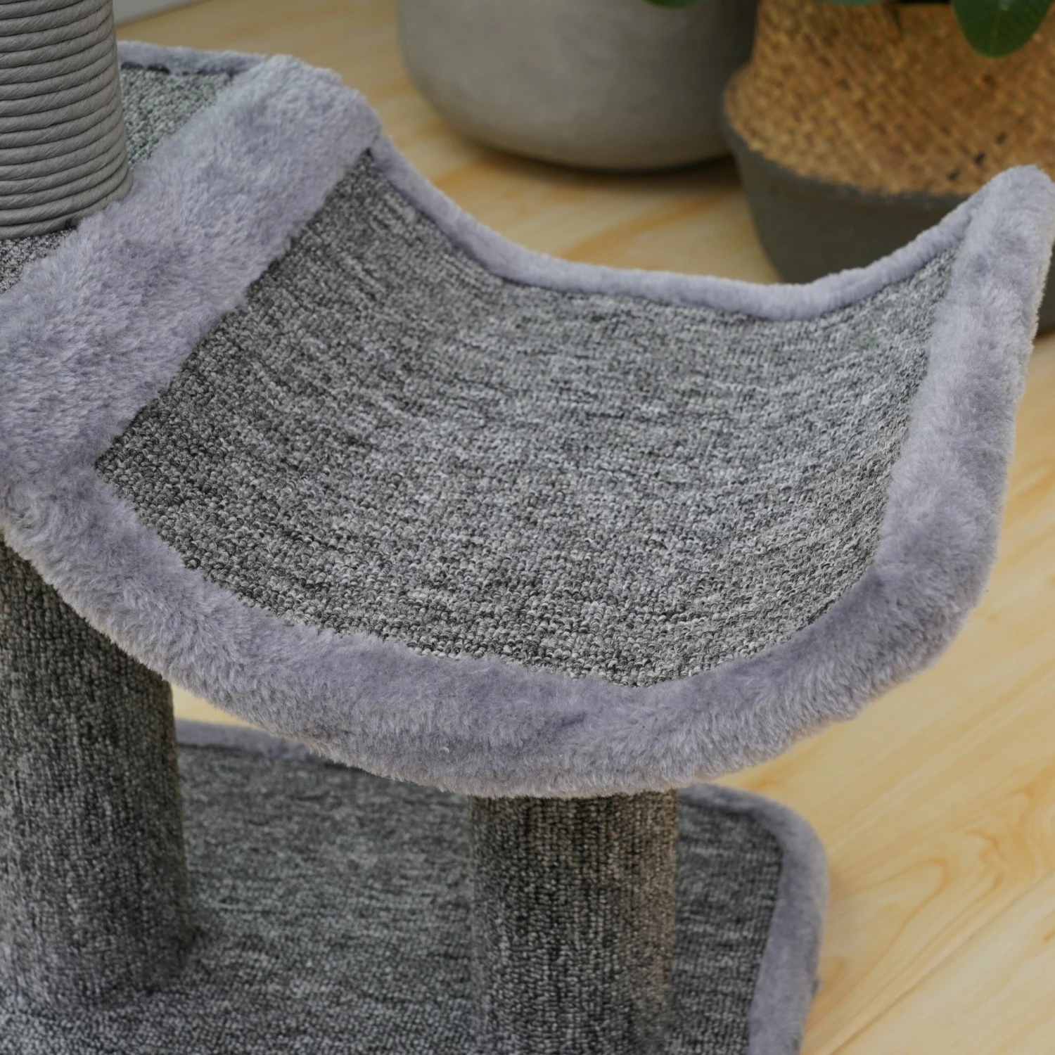 Our 2-in-1 Grimbit cat tree combines a minimalistic and modern design to fit any home décor. This 3-Level cat tree includes a carpet cradle and perch to provide all the comfort your feline friend needs. It also includes a non-toxic scratching post that helps prevent your sofa and other furniture from being damaged. Similar to our Cradle cat tree, but with an alter to design. Grimbit is designed with a shorter Sisal Rope toy for your cat to reach while on the cradle perch! This cat tree was made to make sure your cat feels safe as they climb, play, and rest.