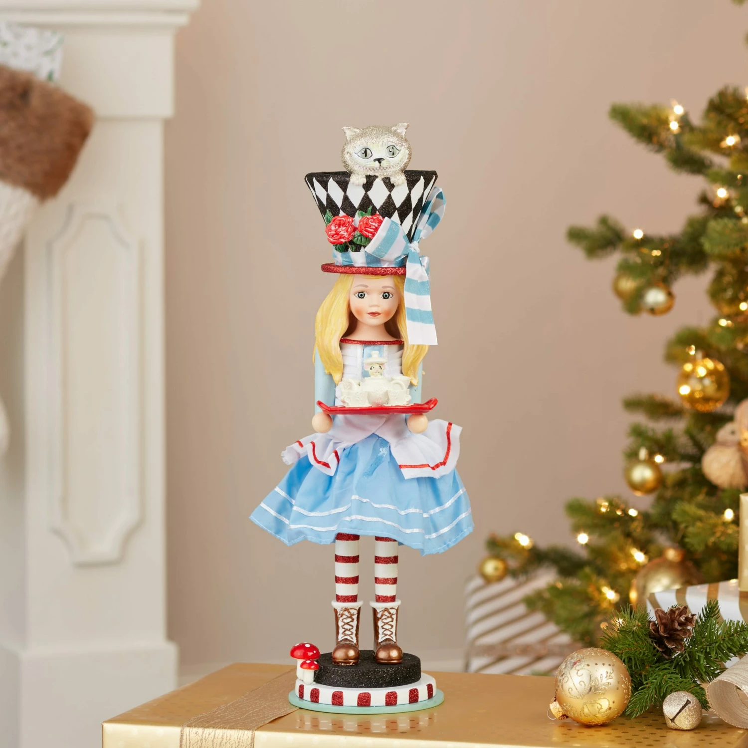 Hollywood™ Nutcrackers is a whimsical collection of nutcrackers created exclusively for Kurt S. Adler, Inc. and features an assortment of designs that put a unique, vibrant, memorable twist on traditional nutcrackers. This 19.5-Inch Alice Nutcracker is inspired by Lewis Carroll’s 1865 novel Alice’s Adventures in Wonderland. Alice is featured here with a tea set and topped off with a black-and-white diamond patterned top hat. Cheshire cat is peeking out of the hat. This nutcracker is a stunning addition to any holiday décor.
