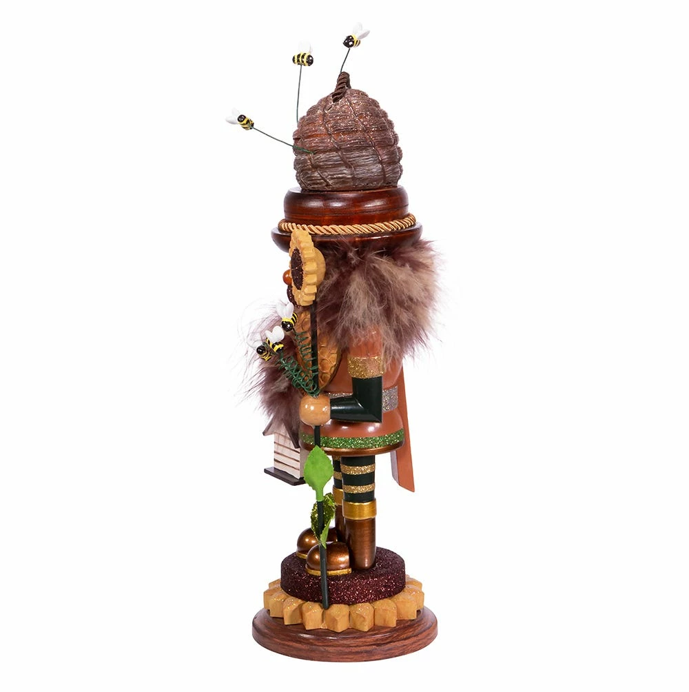 Hollywood™ Nutcrackers is a whimsical collection of nutcrackers created exclusively for Kurt S. Adler, Inc. and features an assortment of designs that put a unique, vibrant, memorable twist on traditional nutcrackers. This 15-Inch Hollywood™ Bee Keeper Nutcracker is standing on a sunflower base while holding a sunflower in his left hand and bee house in his right. His hat is a beehive and his suit has a honeycomb design. Bees are flying all around the nutcracker between the sunflower and beehive. This nutcracker will give you a new friendlier perspectives of bees!