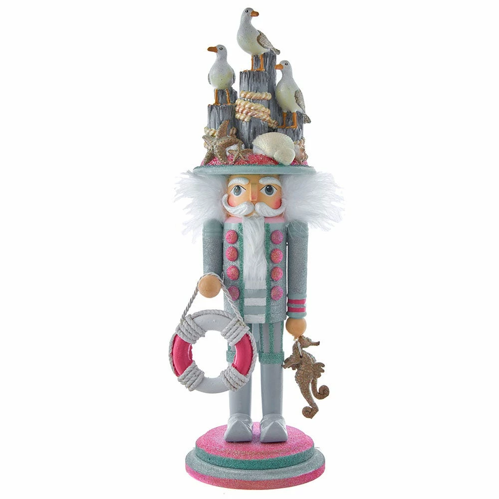 Hollywood Nutcrackers is a whimsical collection of nutcrackers created exclusively for Kurt S. Adler, Inc. and features an assortment of designs that put a unique, vibrant, memorable twist on traditional nutcrackers. Bring the beauty of the coast to any holiday décor or nutcracker collection with this 18-Inch Hollywood Seagull Coastal Nutcracker. It features a nutcracker in shades of gray and pink with bright white hair. Fun coastal touches including a seagull hat with bright pink glittered sand and seashells complete his hat. In one hand he is holding a pink and white life preserver and in the other a miniature glittered seahorse and is standing on a matching glittered base.