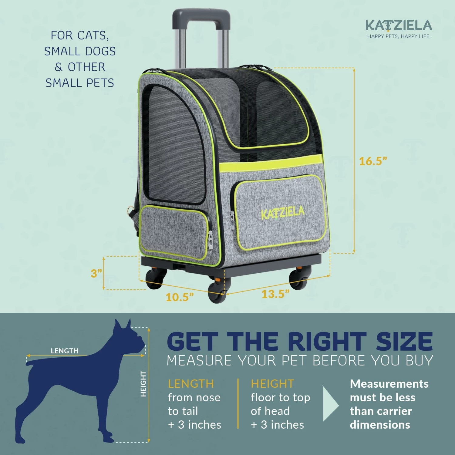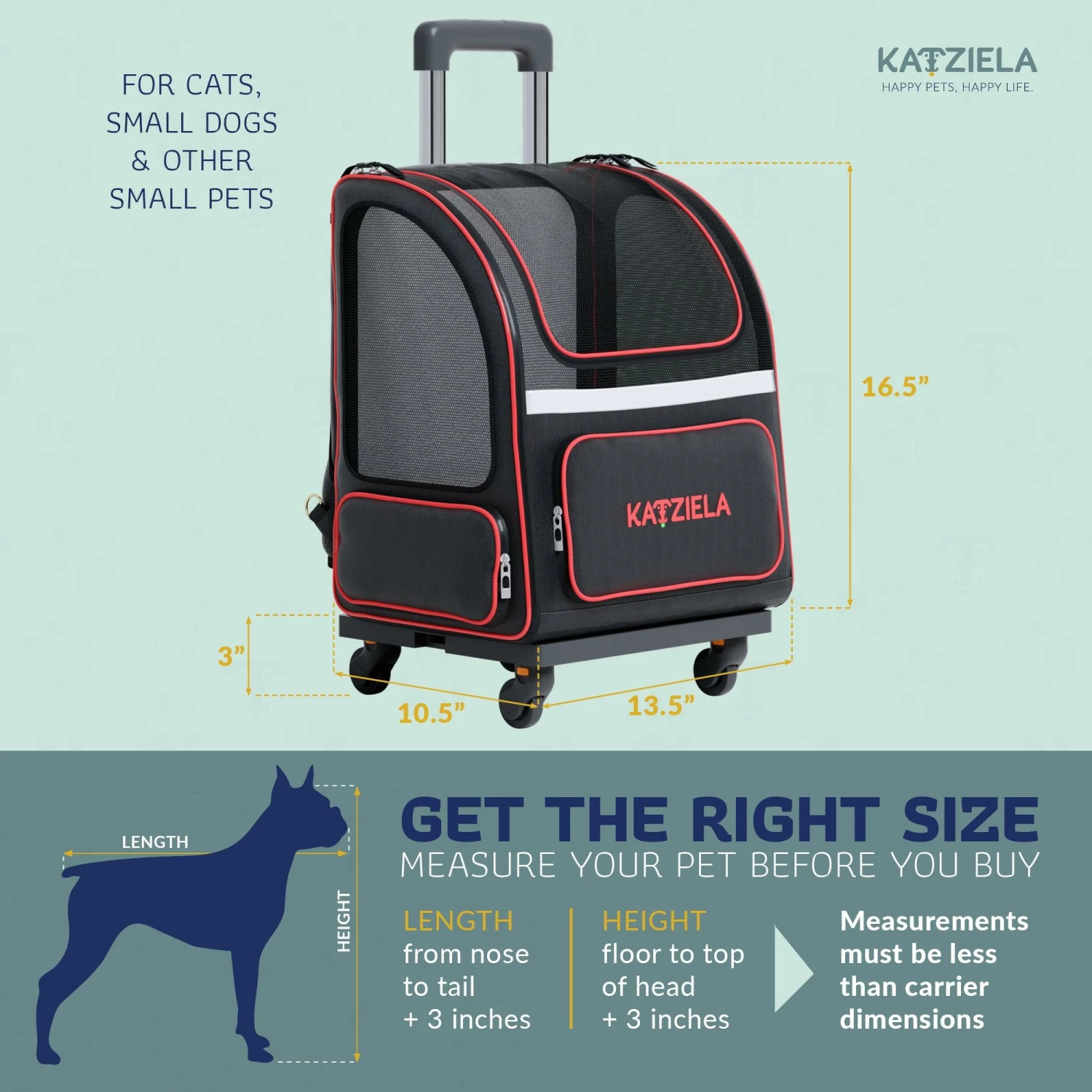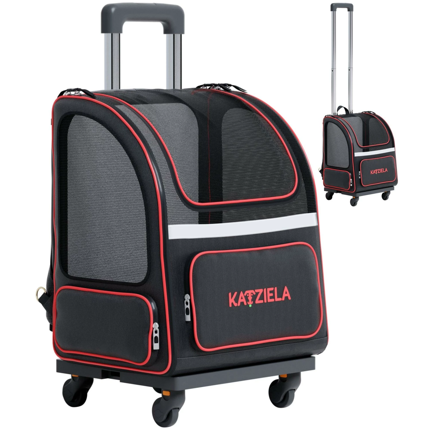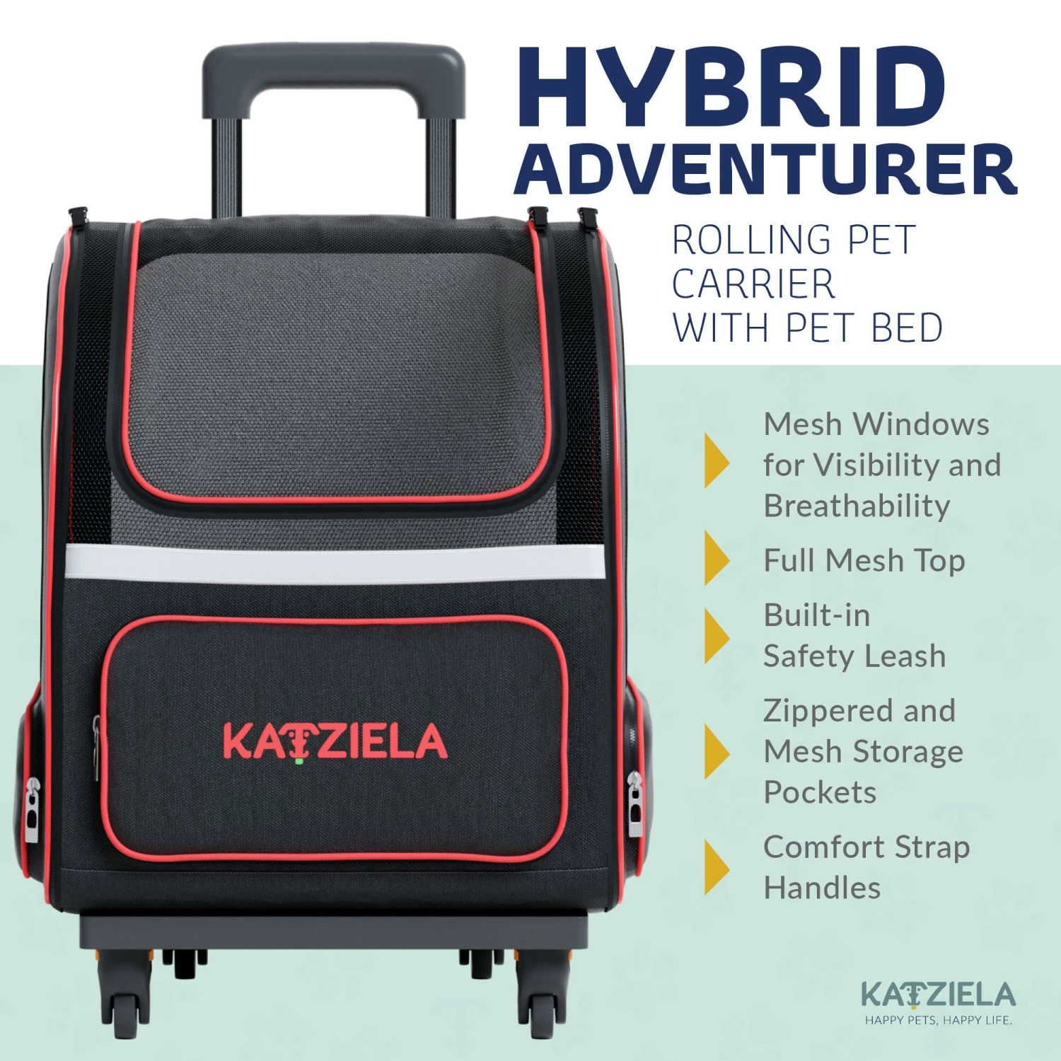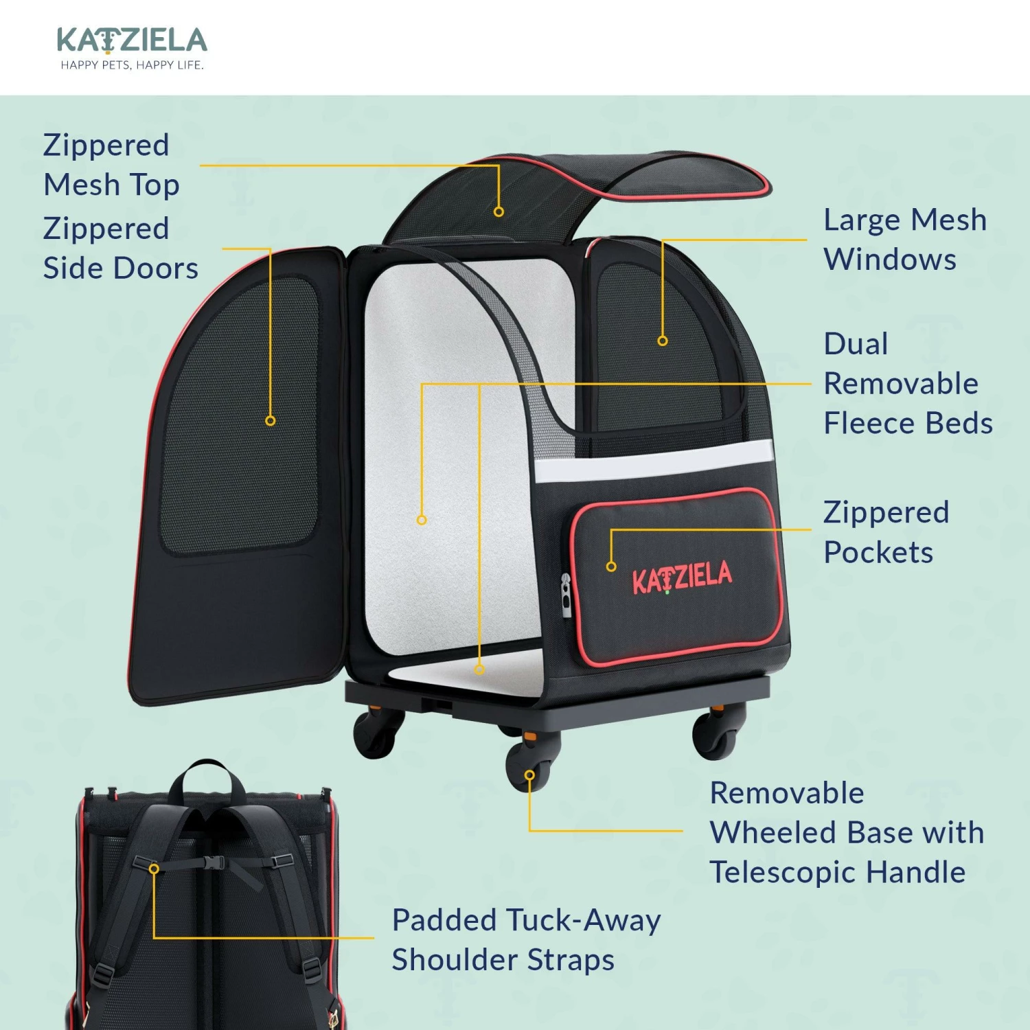 - DUAL ROLLING/BACKPACK CARRIER – Comfortably walk and travel at a brisk pace with your furry best friend safely in tow. The Hybrid Adventurer from Katziela features a detachable wheelbase with a telescopic handle and hidden backpack straps.
