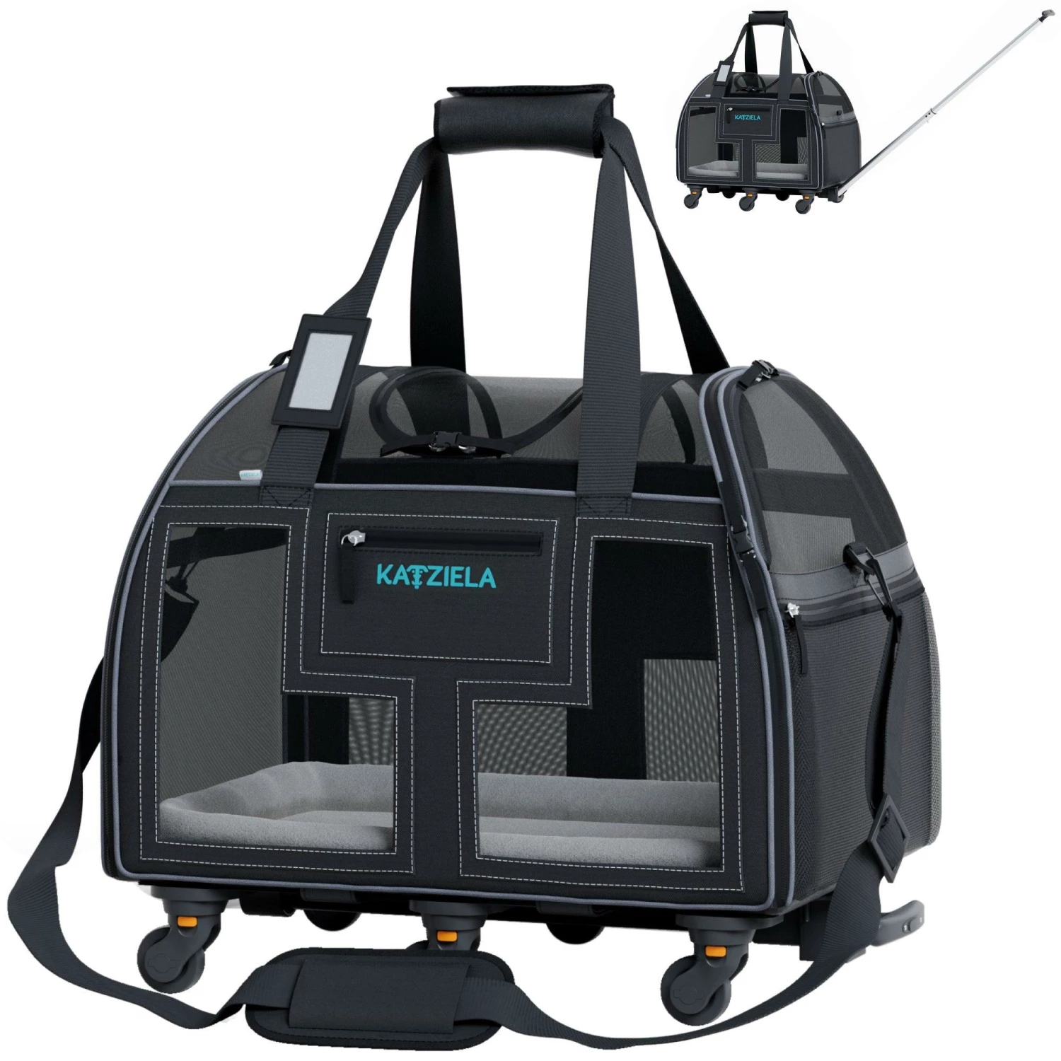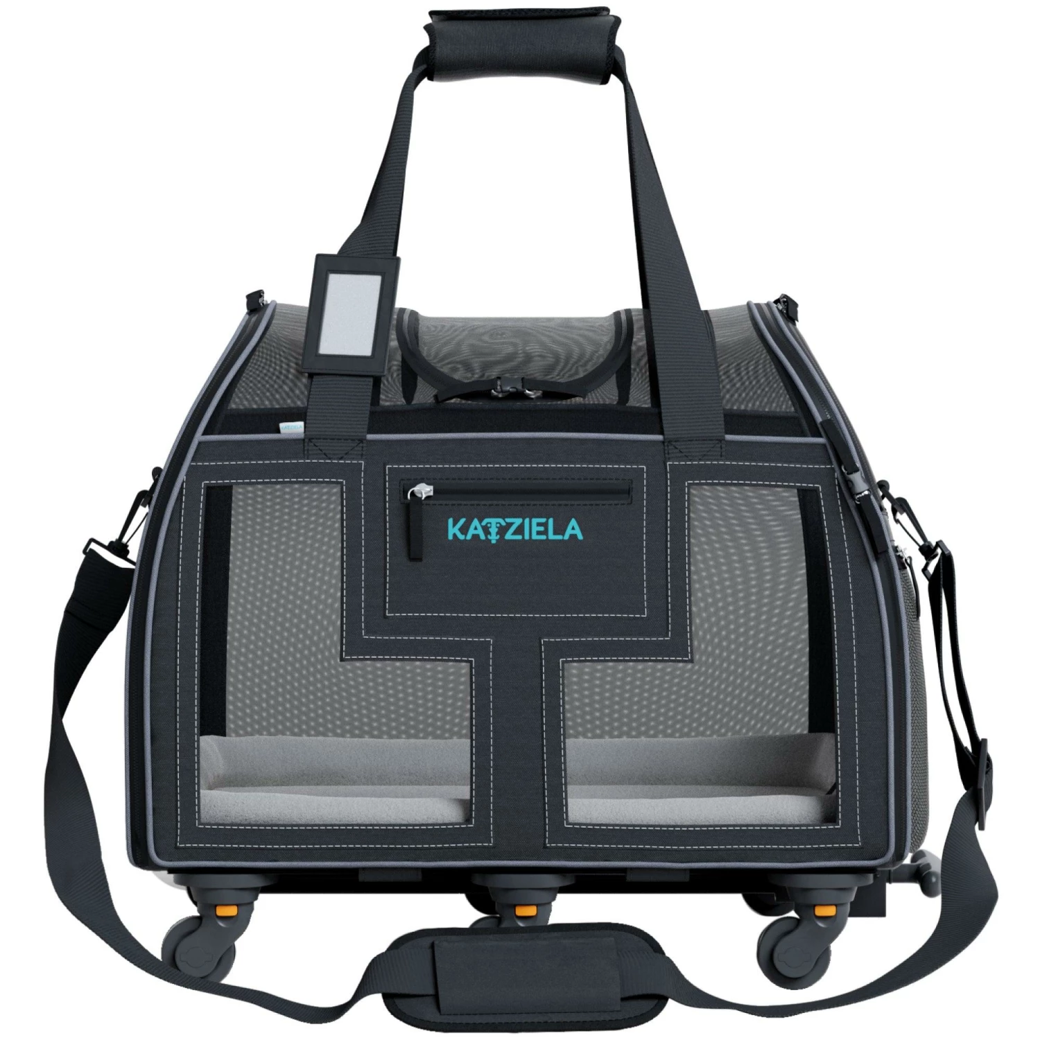 - VERSATILE & EFFICIENT: Pull this carrier on its wheels with a handle strap or metal rod, or carry it with the handle or shoulder strap. It includes a leash to clip on your pet’s collar for security.