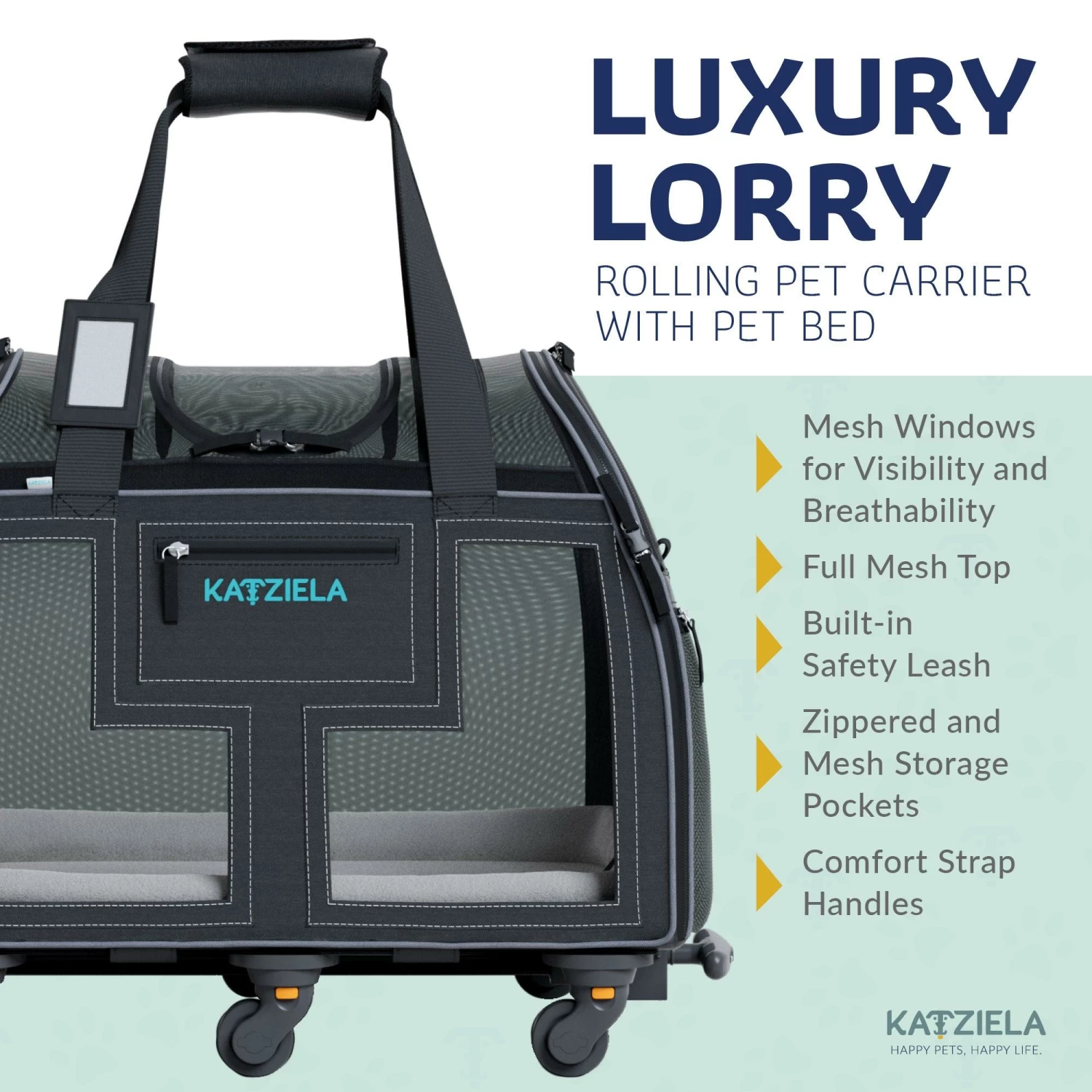 Katziela’s Luxury Lorry comes with a telescopic handle and removable wheels, along with many other features to help provide versatility and long-lasting performance while falling in line with airline requirements and ensuring safety and comfort for your pet. Check with your airline before purchasing.