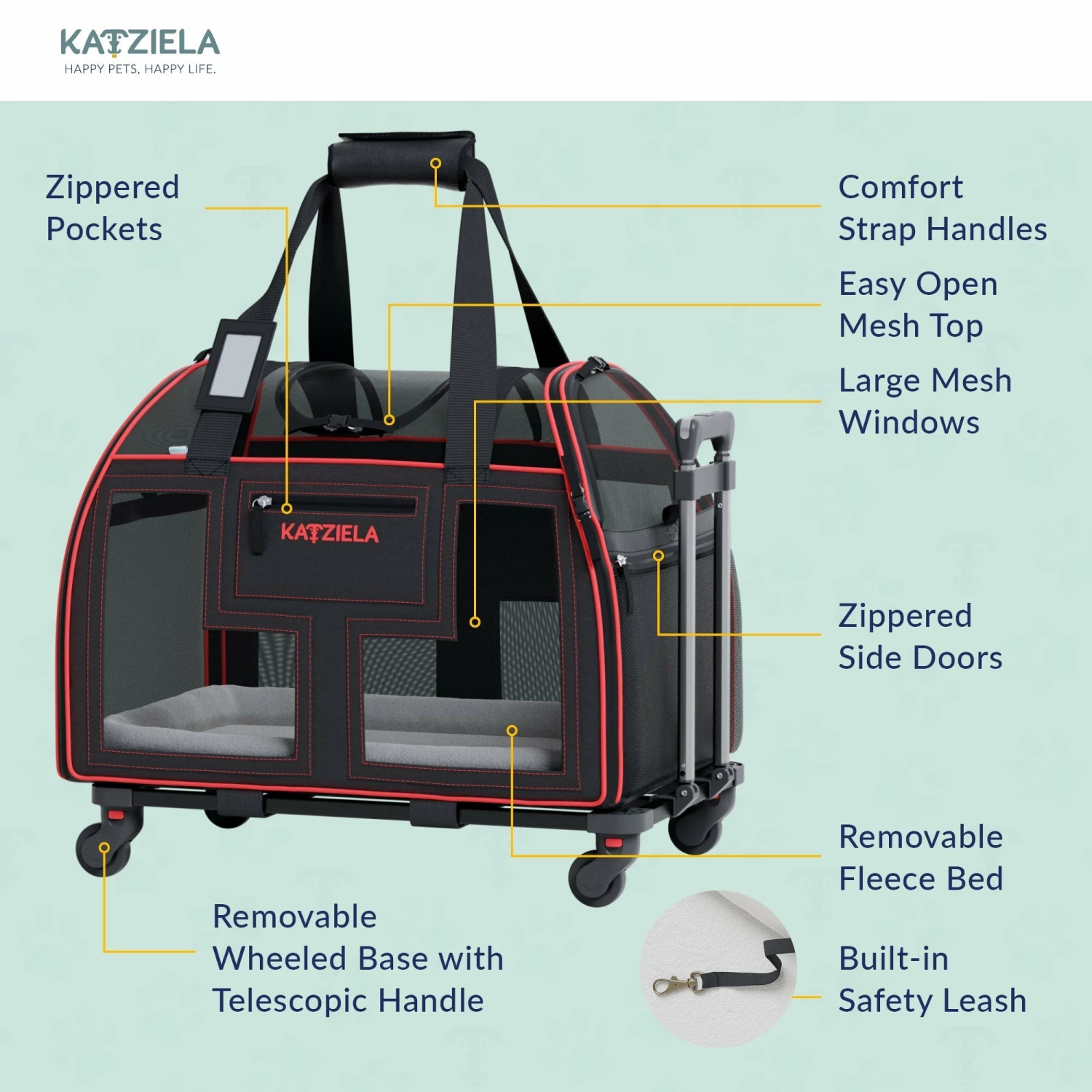 Katziela’s Luxury Lorry PRO comes with a telescopic handle and removable wheels, along with many other features to help provide versatility and long-lasting performance while falling in line with airline requirements and ensuring safety and comfort for your pet.