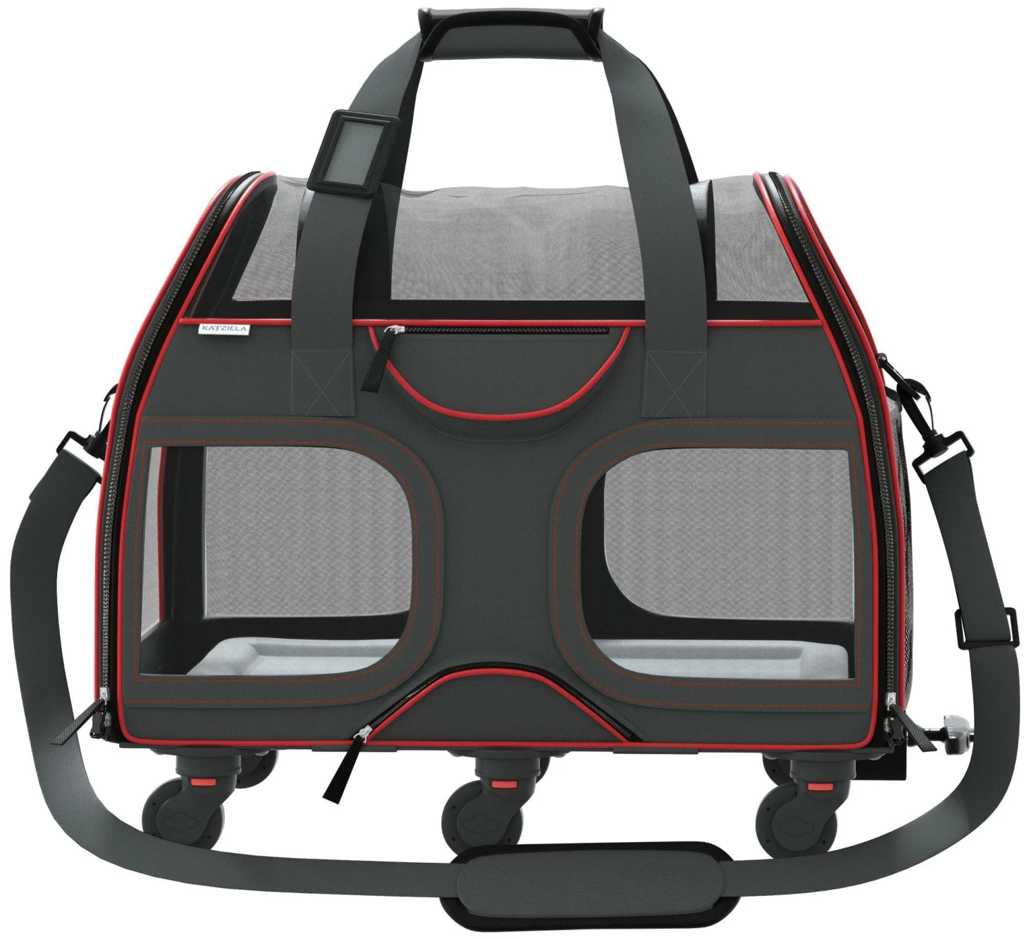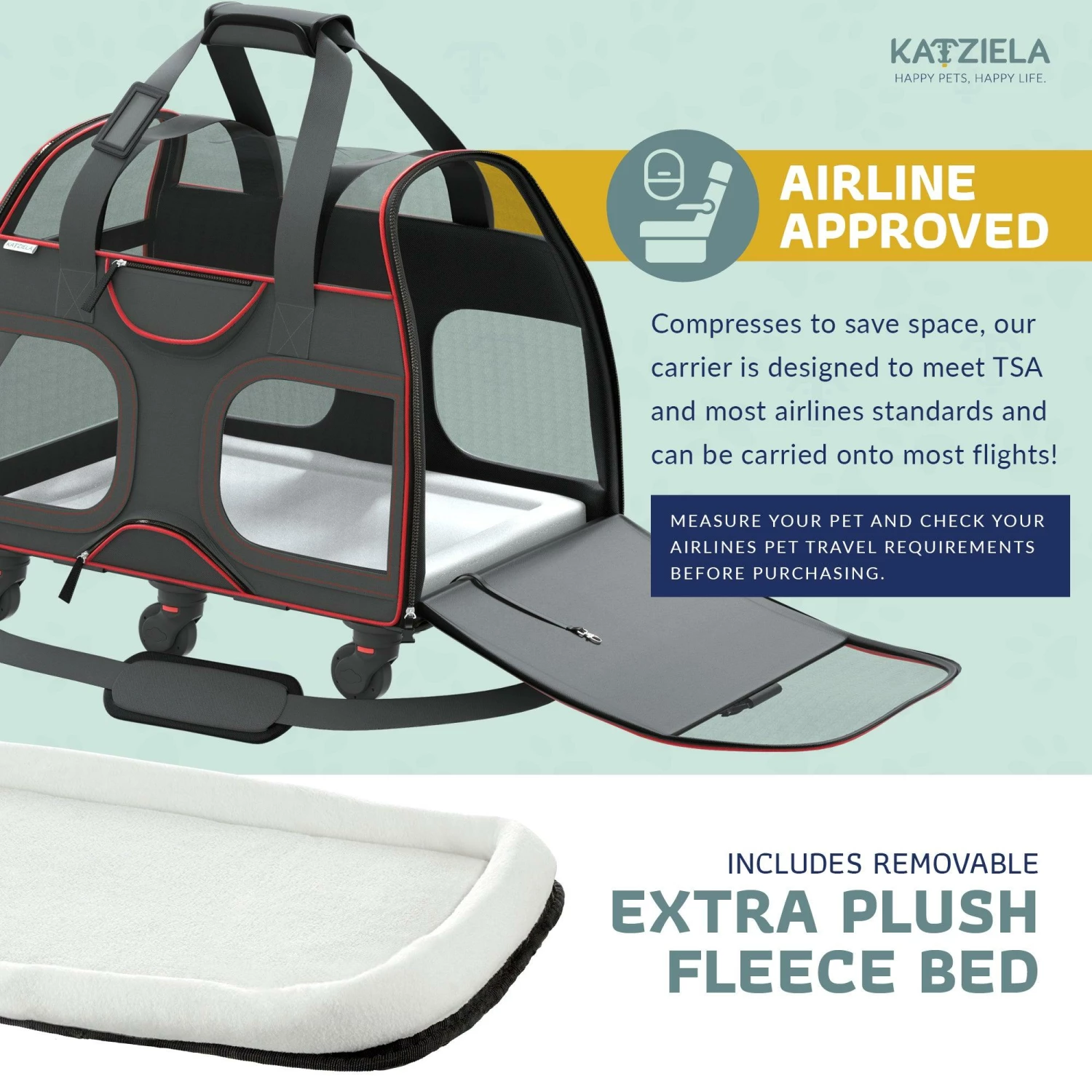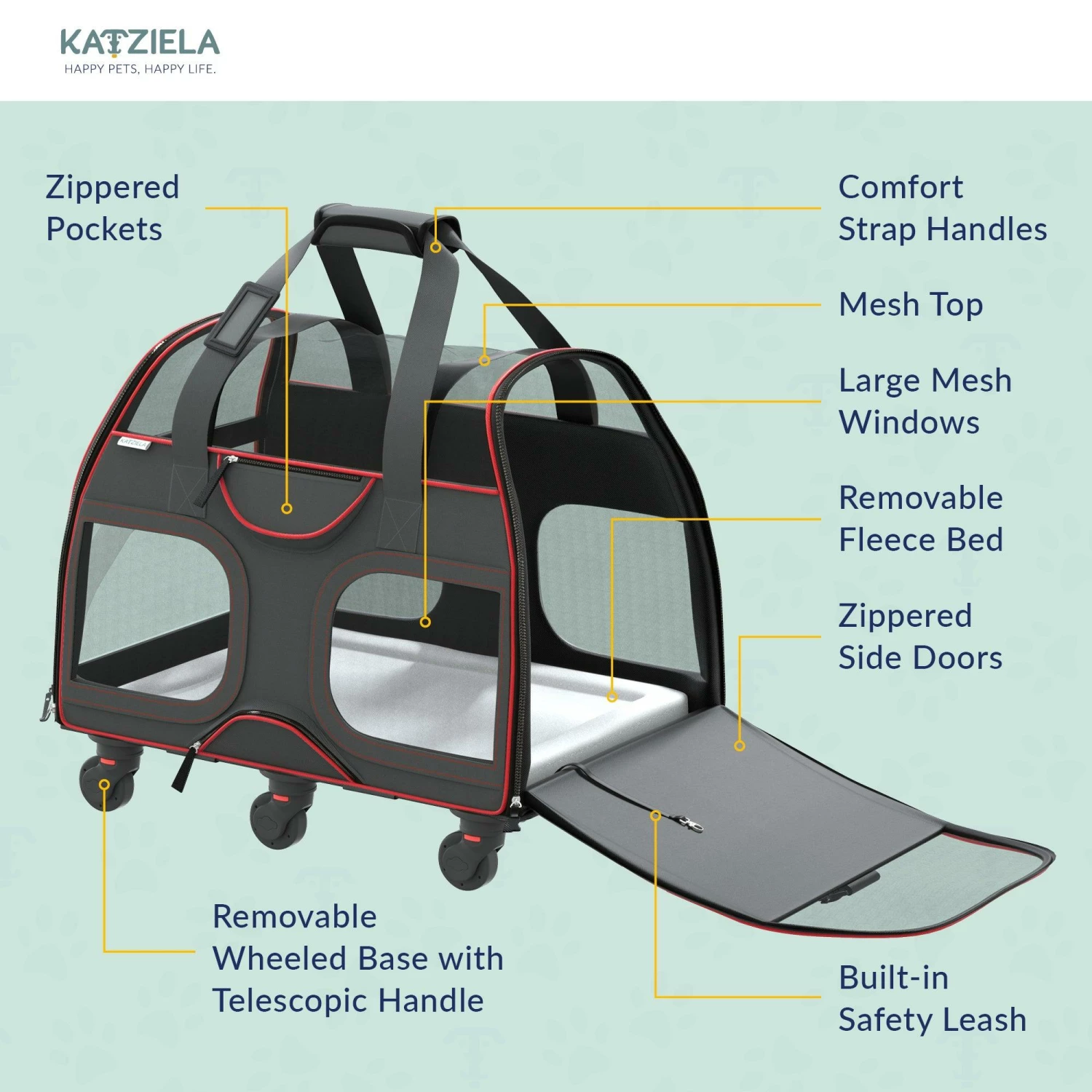 Katziela’s Luxury Rider comes with a telescopic handle and removable wheels, along with many other features to help provide versatility and long-lasting performance while falling in line with airline requirements and ensuring safety and comfort for your pet. Check with your airline before purchasing.