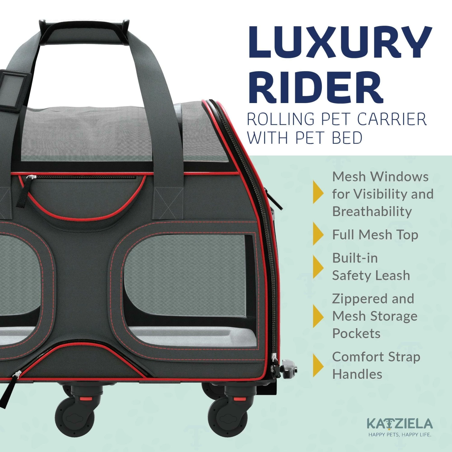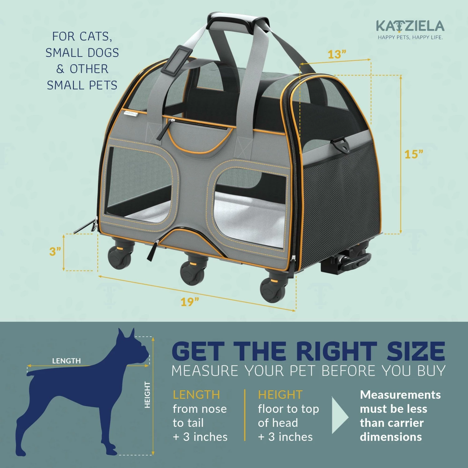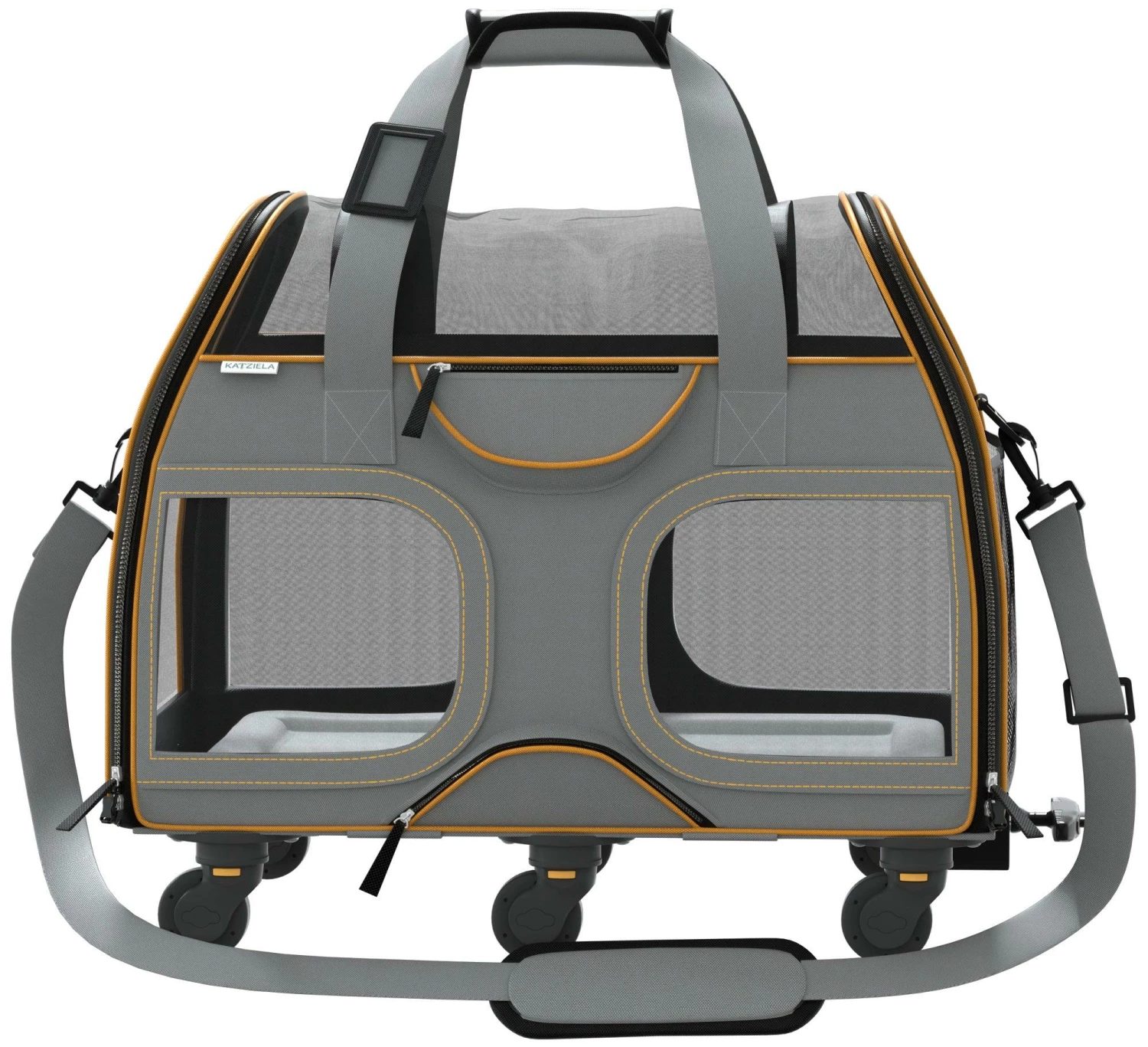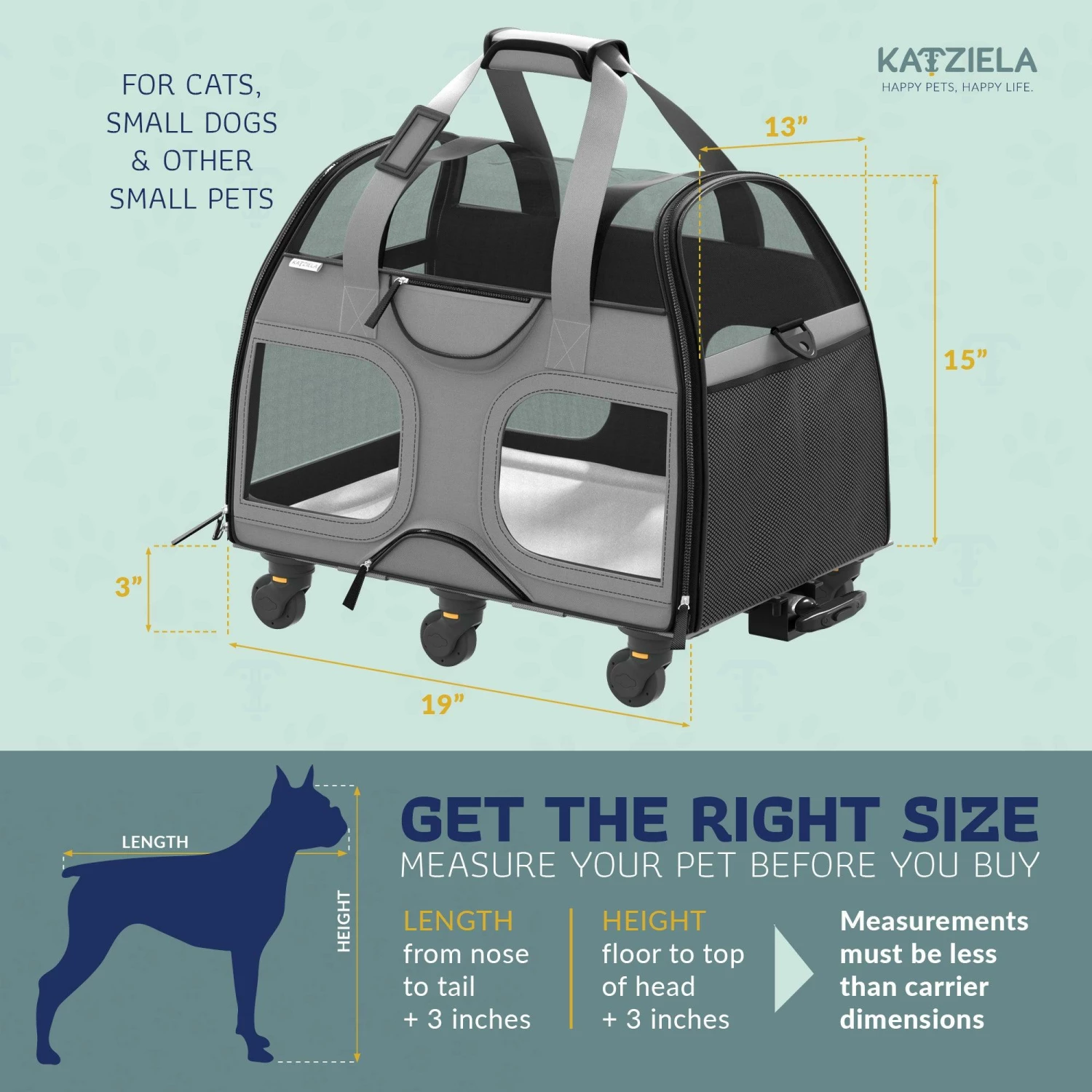 Katziela’s Luxury Rider comes with a telescopic handle and removable wheels, along with many other features to help provide versatility and long-lasting performance while falling in line with airline requirements and ensuring safety and comfort for your pet. Check with your airline before purchasing.