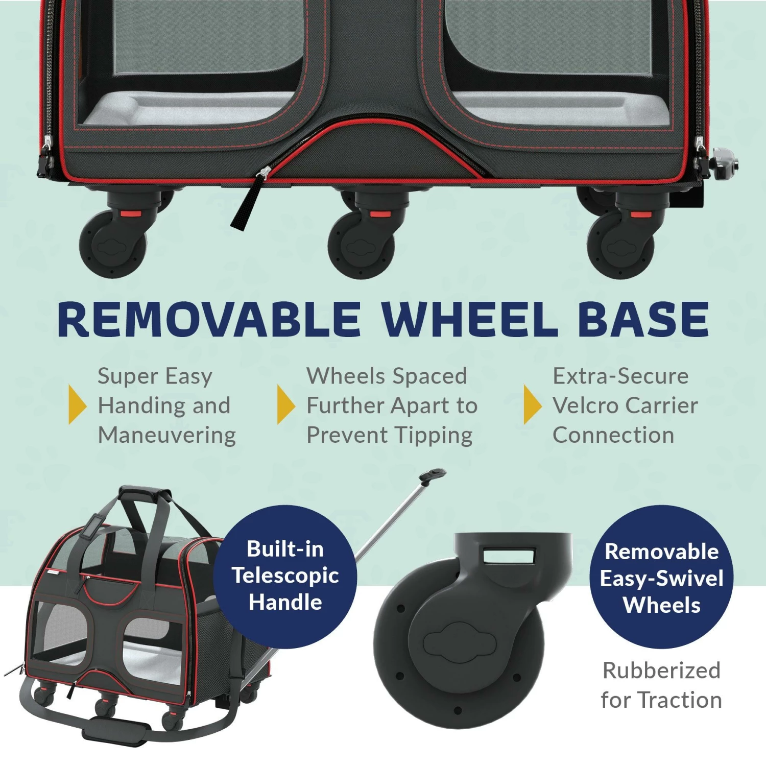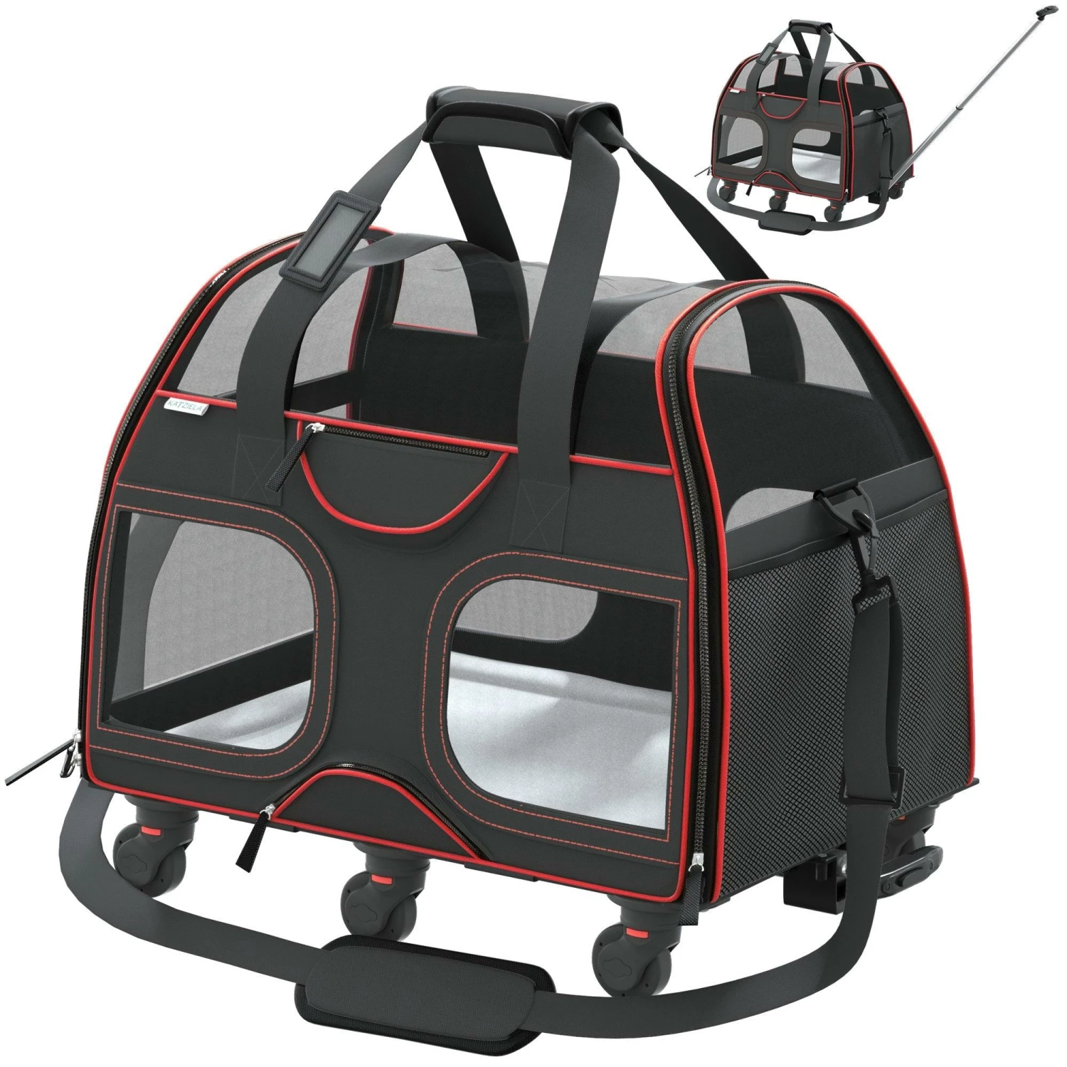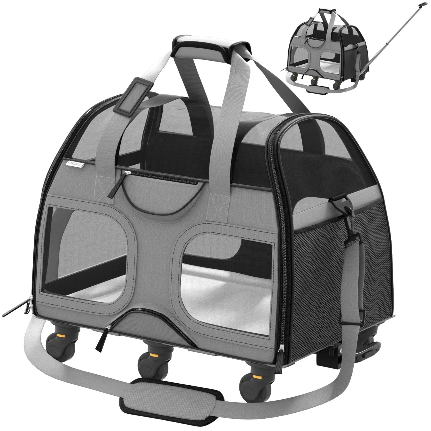 - VERSATILE & EFFICIENT: Pull this carrier on its wheels with a handle strap or metal rod, or carry it with the handle or shoulder strap. It includes a leash to clip on your pet’s collar for security.