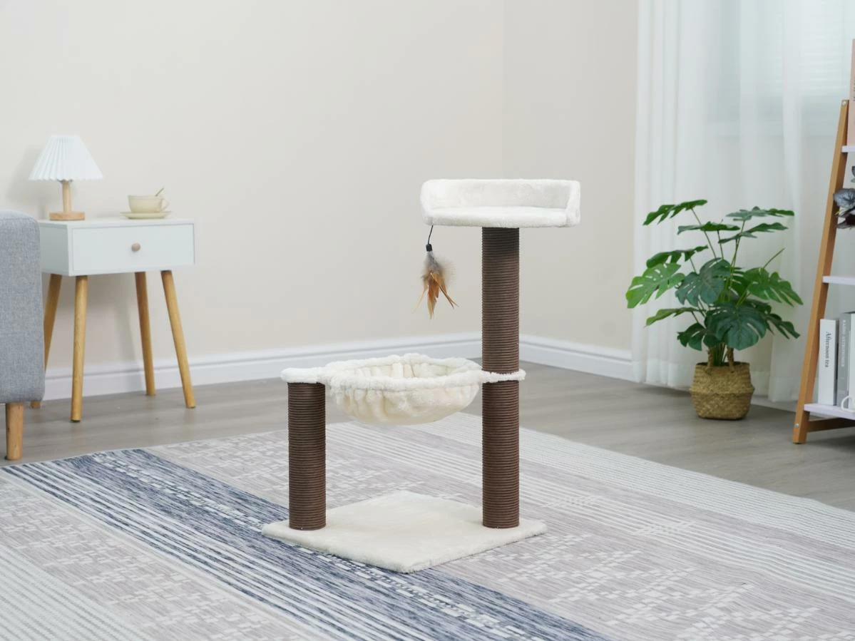 - Our cat tree includes a soft plush perch as well as a cozy plush hammock that offers maximum comfort for nap time