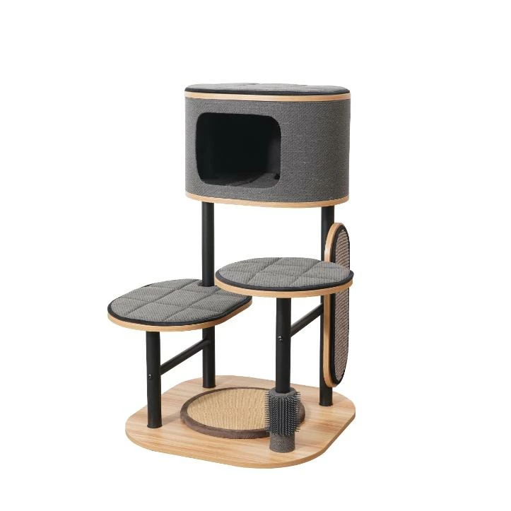 PetPals Starbz is our stylish Industrial Design with multiple functions making it perfect for your cat. This 4-level cat tree has two padded perches and a large comfortable condo. Starbz also features two scratching pads, one round carpet scratcher at the base, and a natural sisal scratcher on the side, which we made removable so you can replace it when needed. This design is built with a steel tubing frame, laminated wood, and soft linen so it’s durable, sturdy, and aesthetically pleasing. There is also a rubber groomer at the bottom so your cat can rub and scratch those hard-to-reach spots.