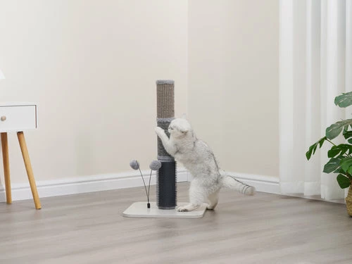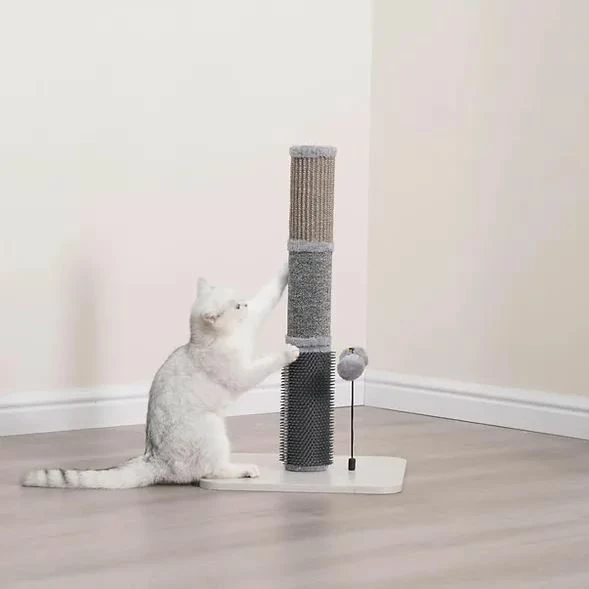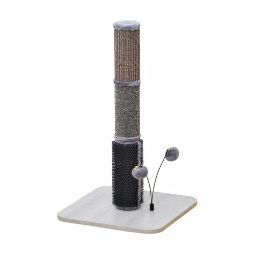 Urbane Grey Multi-Activity Scratching Post is the perfect scratcher for your active pet. This interactive design features a natural sisal carpet that helps keep your cat’s claws trimmed and healthy and a carpet material for a softer feel. The urbane modern design includes two pom-pom toys for your cat to enjoy hours of playtime. In addition, Urbane features a non-toxic rubber grooming brush for your cat to enjoy a good massage. It also features a durable grey laminated wood base that will be the perfect addition to your home décor. All instructions and tools are included for an easy assembly process.